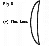 (NOT TO SCALE) There are several ways to recognise these lenses. Again the obvious one is to examine the lens to feel if the centre of the lens is greater than the edge, If this is not possible, or you cannot determine by feel, look through the lens at some print and if the print appears larger through the lens then you have a plus lens. If, by looking through the lenses the person's eye appears larger, then they are wearing a plus correction lens.