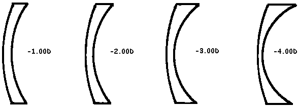 SHORT SIGHT (MYOPIA) .A short sighted (myopic) person can usually see objects quite well that are close. i.e. to read and see television, but has difficulty in focussing on objects as they get further away. The further away the object, the more difficult it is to focus correctly. This condition can be corrected by the use of a MINUS POWERED LENS. (AN EASY WAY TO ASSOCIATE THIS IS MYOPIA = MINUS). The form that a minus powered lens takes is that the centre of the lens is thinner than the edge of the lens, as shown in the diagram below.