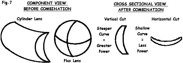 These two lenses could be combined into one lens by working the additional cylindrical lens into the surface of the normal plus spherical lens so that at certain angles there would be more power in the lens than at other angles, as FIG.7 illustrates.