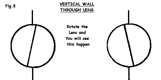 By combining these two lenses, all of the rays of light passing through the lenses are now brought together to form an image on the focal point of the retina. This giving sharp vision through 180 degrees, which means that we would be able to see all of the spokes on our cycle wheel clearly, The same principle applies in the case of Minus powered lenses in that an extra cylinder power would be worked into the surface of the normal Minus lens. The best way to recognise if a lens has a cylinder power combination is to look through the lens from the rear at a vertical line, for example the upright of a door or window, and rotate the lens. If the line moves from the perpendicular or appears to lean when the lens is rotated then there is certainly a cylinder power in the lens (See FIG.8)