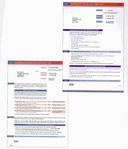If you are entitled to FULL help your Certificate will tell you that whilst it is in force you will be entitled to FREE prescriptions, Free Dental Treatments, Free NHS wigs, Free Sight Tests, and the full value of an Optical Voucher Towards the Cost of Spectacles, and Refunds for travel to and from hospital, while having treatment. If you are only entitled to Partial Help, you will receive a partial help certificate and the information given in the letter will tell you which members of your family can claim help and which benefits, if any you can claim towards.